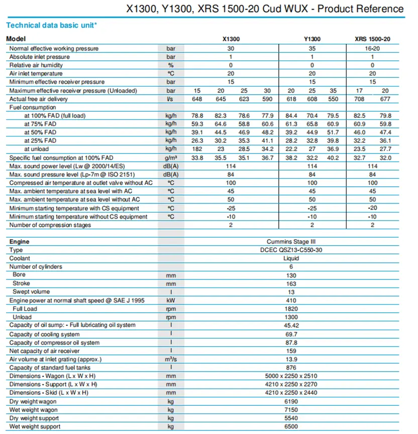 Atlas Copco X1300, Y1300 a XRS 1500-20 sú odhlučnené, dvojstupňové skrutkové kompresory so vstrekovaním oleja, poháňané kvapalinou chladeným šesťvalcovým dieselovým motorom Cummins.