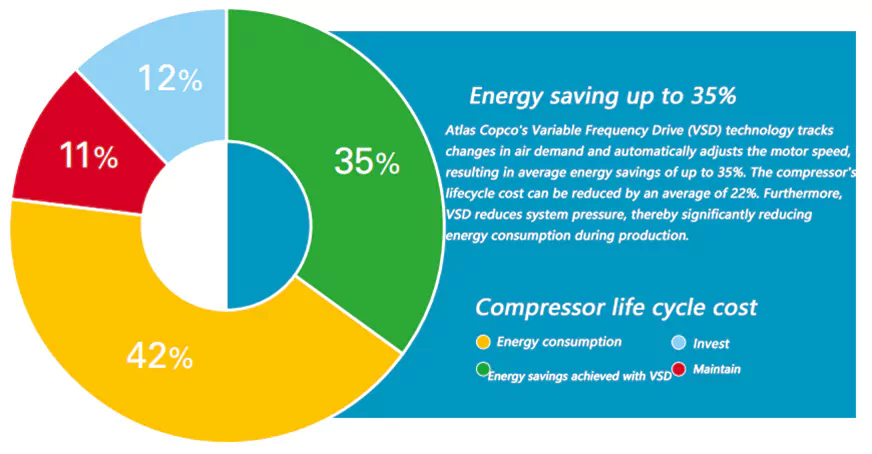 Spotreba energie predstavuje viac ako 80 % celkových nákladov životného cyklu bezolejového skrutkového vzduchového kompresora. Okrem toho elektrina používaná pri výrobe stlačeného vzduchu predstavuje viac ako 40 % celkových nákladov továrne na elektrickú energiu. Aby sa znížili náklady na energiu, Atlas Copco je priekopníkom technológie Variable Frequency Drive (VSD) v priemysle stlačeného vzduchu. VSD nielen šetrí značné množstvo energie, ale aj chráni životné prostredie pre budúce generácie. Vďaka neustálym investíciám do tejto technológie je spoločnosť Atlas Copco schopná ponúknuť najširší sortiment integrovaných kompresorov VSD na trhu.