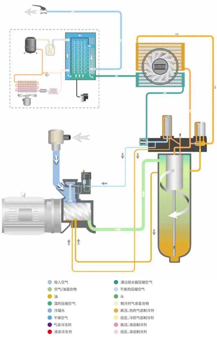· Nezávislý chladiaci ventilátor, vysoko účinný chladič a vstavaná sušička s tlakom rosného bodu 5 °C, aby sa lepšie zabránilo kondenzácii a korózii potrubia v potrubnej sieti