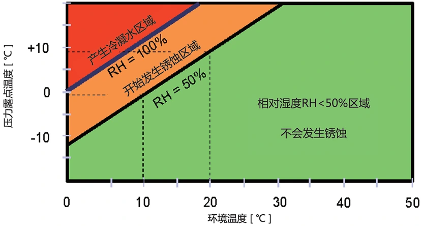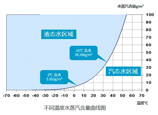 Obrázok ukazuje, že vzduch zadržiava rôzne množstvá vodnej pary pri rôznych teplotách. Vzduch sa ochladí a zníži sa aj hladina jeho vodnej pary. Krivka má body, ktoré označujú hladiny nasýtených vodných pár. Teplota pre každý z týchto bodov je rosný bod. Nižší rosný bod znamená menej vodnej pary v stlačenom vzduchu. Chladiace sušičky vzduchu používajú toto fyzikálne pravidlo. Nechali stlačený vzduch vymeniť teplo s chladivom. Táto akcia znižuje teplotu stlačeného vzduchu. Vodná para ochladeného vzduchu sa mení na tekutú vodu. Táto kvapalina sa vypustí zo systému. Napríklad obsah nasýtenej vodnej pary stlačeného vzduchu pri 35 °C je 39,286 g/m³. Po výmene tepla s chladivom a ochladení na 3 °C je obsah nasýtenej vodnej pary 5,953 g/m³. Rozdiel 33,333 g / m³ udáva množstvo vody odstránené po ochladení a dehydratácii lyofilizátorom. To znamená, že po prechode stlačeného vzduchu cez vymrazovaciu sušičku sa odstráni približne 85 % vlhkosti, čím sa zabezpečí, že sušenie stlačeného vzduchu spĺňa požiadavky výrobného procesu.