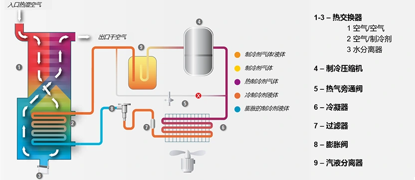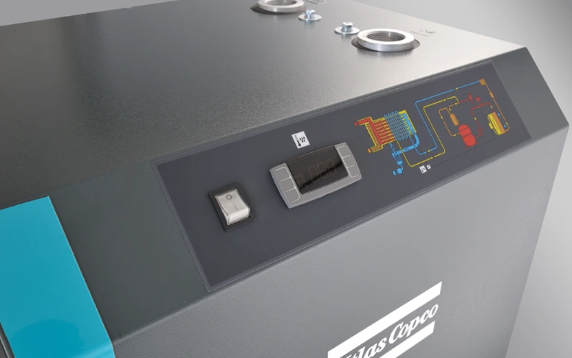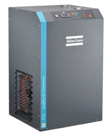 Sušička chladeného vzduchu Atlas Copco typu F využíva výmenník tepla tri v jednom, ktorý kombinuje vzduch/vzduch, vzduch/chladivo a separátory vody. To účinne odstraňuje kvapalnú vodu oddelenú po ochladení a predchladzuje stlačený vzduch, čím sa zlepšuje účinnosť výmeny tepla. Súčasne ohrieva dehydrovaný stlačený vzduch na teplotu o 10°C nižšiu ako je vstupná teplota, čím zaisťuje relatívnu vlhkosť stlačeného vzduchu po úprave pod 50%, zabraňuje korózii a dosahuje skutočný dehydratačný efekt chladiaceho sušiča vzduchu.
