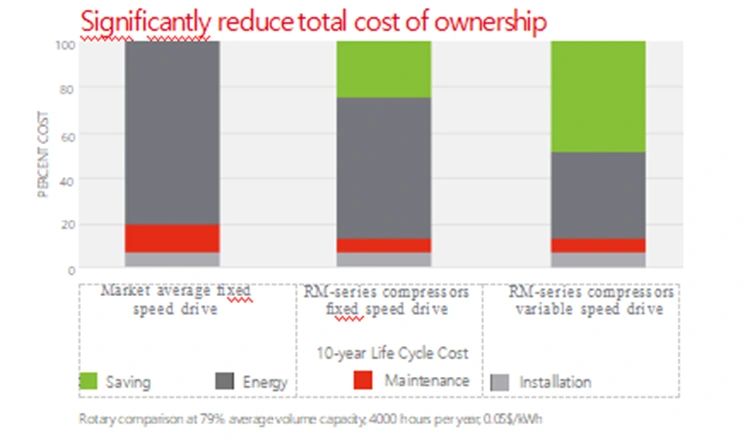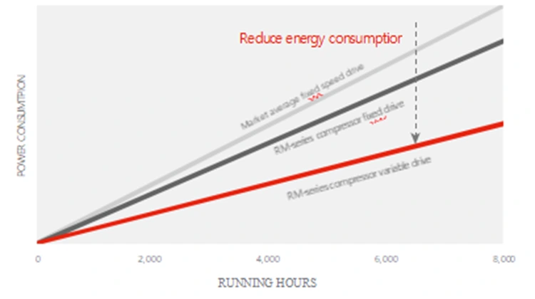 každý vzduchový kompresor série RM je vybavený úplne novou, vysoko účinnou hlavnou jednotkou, ktorá kombinuje motor s pevnou rýchlosťou IE3 a technológiu motora s premenlivou frekvenciou ECO*-PM VSD IE5, čo vám pomôže ušetriť až 12 – 30 % nákladov na energiu.